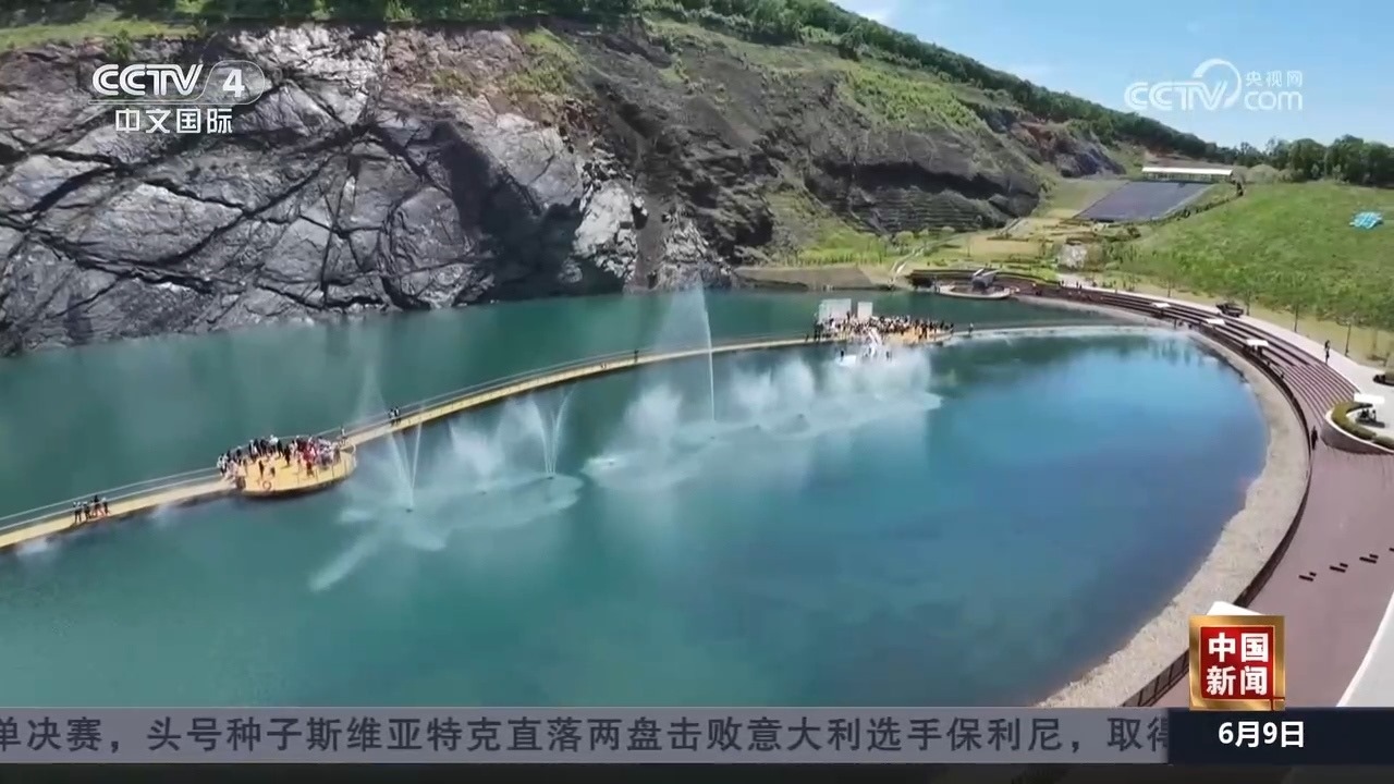 在黑龍江雙鴨山的翡翠湖礦坑公園,藍(lán)綠色湖水在陽光照耀下如詩如畫,游客們身處山野間,感受著自然之美和夏日清涼。
