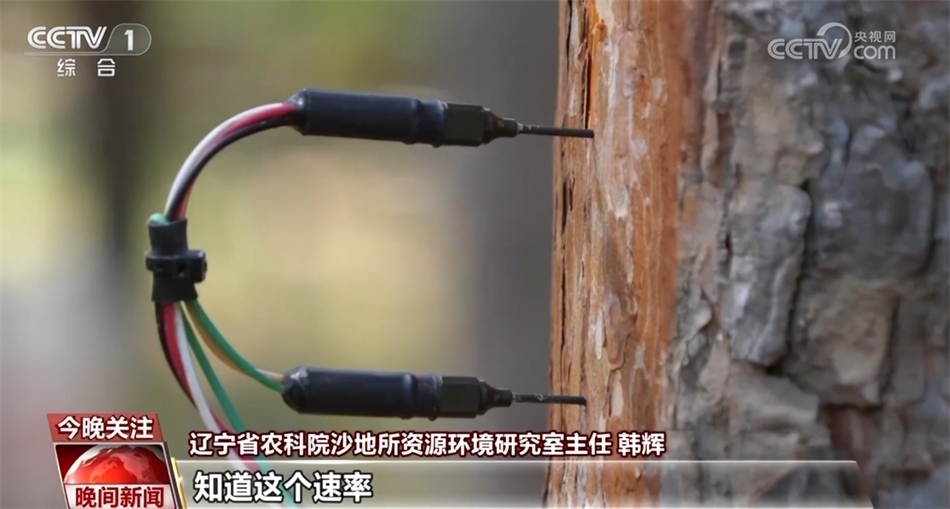 記者在采訪時(shí)看到,一棵樹的樹干上插了兩根探針,據(jù)遼寧省農(nóng)科院沙地所資源環(huán)境研究室主任韓輝介紹,這是用來監(jiān)測(cè)樹干水分的。通過監(jiān)測(cè)兩根探針之間的溫差,他們就能夠計(jì)算出這棵樹的液流速率。知道這個(gè)速率,他們就可以了解這棵樹的生長(zhǎng)狀態(tài),這個(gè)實(shí)驗(yàn)的最終目的,是想得出在單位面積上到底有多少棵樟子松最合理。