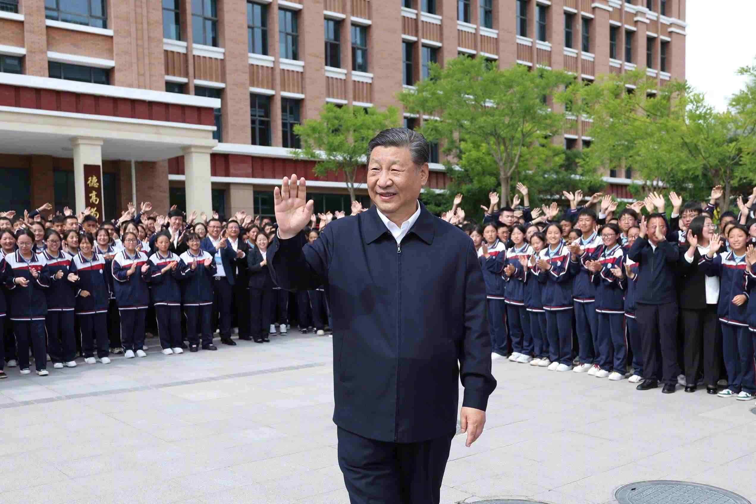 2024年6月18日下午,在青??疾煺{研的習近平總書記來到果洛西寧民族中學,了解當地深入推進教育工作東西部協(xié)作和對口支援等情況。