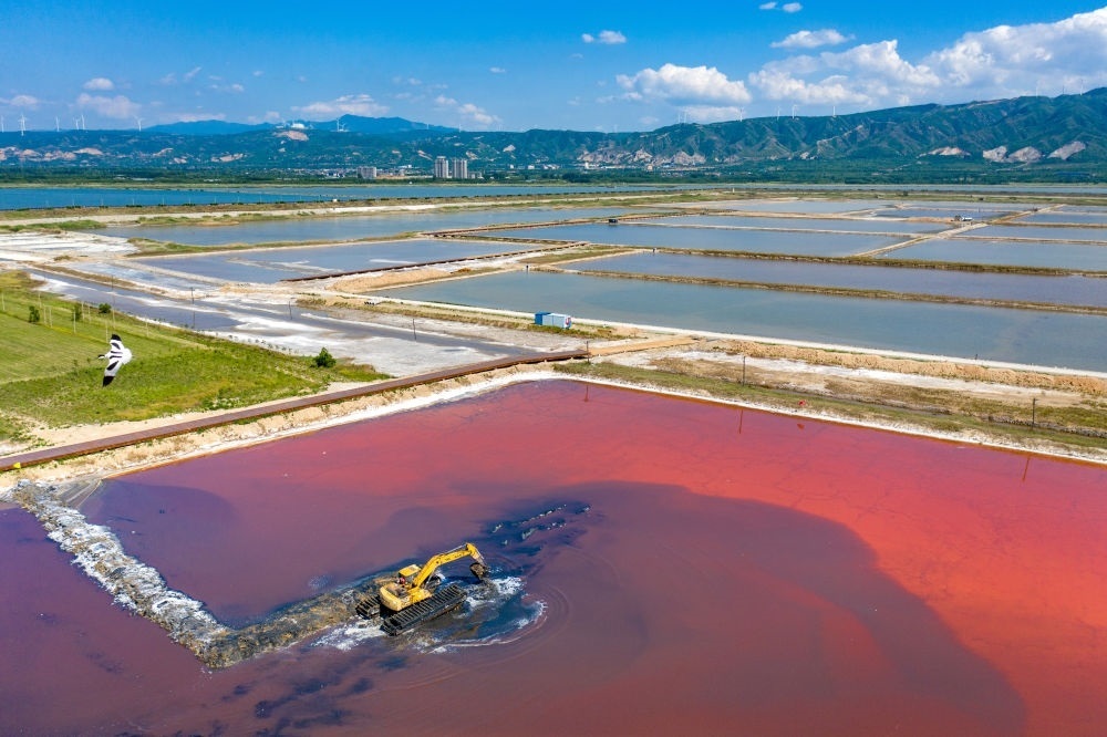 2016年8月25日,工人在運(yùn)城鹽湖進(jìn)行扒鹽作業(yè)。