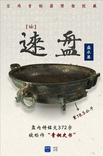 這件青銅器是被稱作“青銅史書”的逨盤。盤內(nèi)鑄銘文372字,完整記錄了單氏家族八代人輔佐西周12位周王征戰(zhàn)、理政、管治林澤的重要史事。從銘文中可看出,周人將家族命運(yùn)和國(guó)家命運(yùn)緊密結(jié)合,也是后來(lái)儒家“修身、齊家、治國(guó)、平天下”的思想基礎(chǔ)。