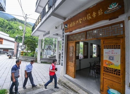 在浙江省麗水市青田縣方山鄉(xiāng)的鄉(xiāng)村振興金融服務(wù)站內(nèi),青田農(nóng)商銀行服務(wù)隊志愿者上門服務(wù),打通金融服務(wù)“最后一公里”。新華社記者徐昱 攝