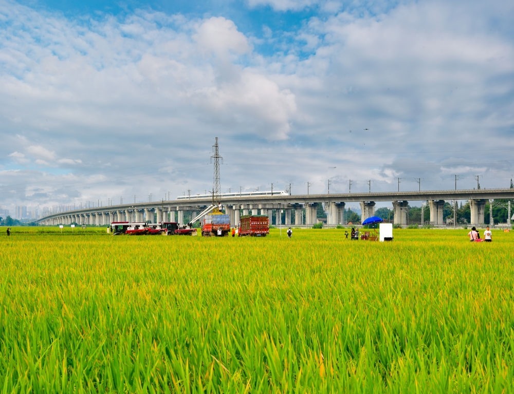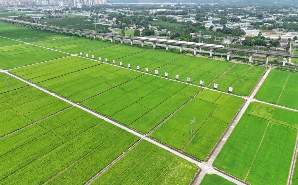 2024年7月26日,一列高鐵列車從永豐村高標(biāo)準(zhǔn)農(nóng)田上方的高架橋上疾馳而過(無(wú)人機(jī)照片)。