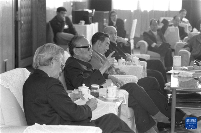 1991年4月6日,任建新同志(左二)參加七屆全國人大四次會議山西省代表團小組會,聽取代表們對最高人民法院工作報告的意見。