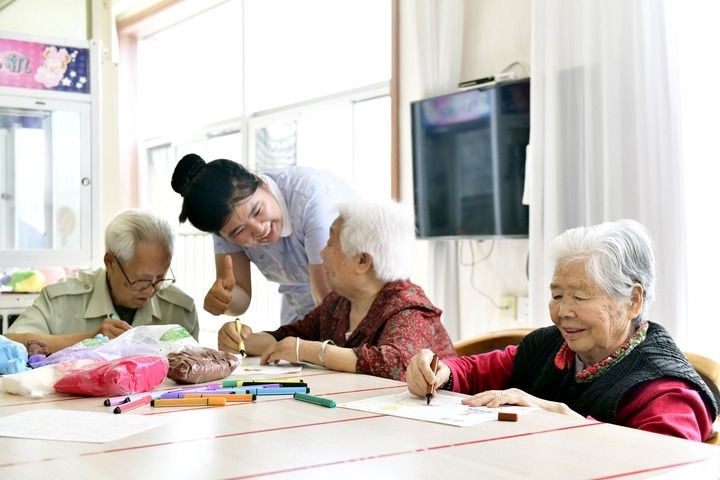 2024年5月25日,在山東省日照市東港區(qū)石臼街道日照幸福護理院,老人在工作人員的陪護下做填圖游戲。新華社記者 郭緒雷 攝
