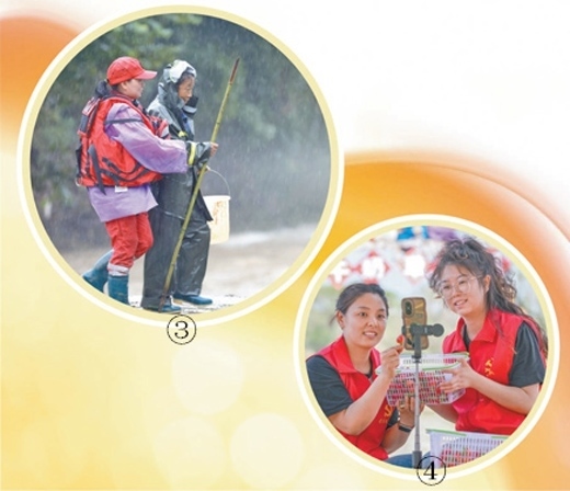 圖③:安徽省歙縣山越救援隊(duì)黨員(左)在轉(zhuǎn)移受災(zāi)群眾。樊成柱攝(影像中國(guó)) 圖④:新疆維吾爾自治區(qū)烏蘇市黨員志愿者到田間地頭直播銷售草莓。李仁錫攝(影像中國(guó))