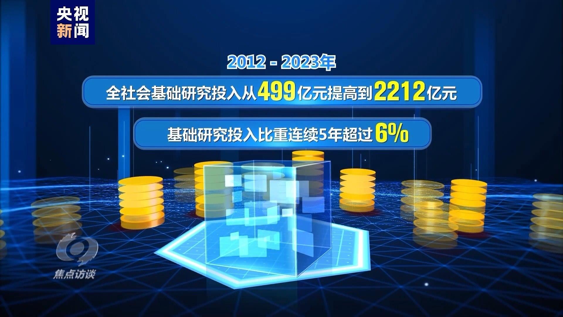 2012—2023年,全社會(huì)基礎(chǔ)研究投入從499億元提高到2212億元,基礎(chǔ)研究投入比重連續(xù)5年超過6%。