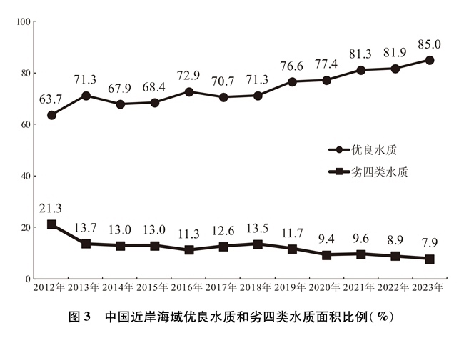 通過深入推進重點海域綜合治理、陸海污染協(xié)同防治,持續(xù)建設美麗海灣,中國近岸海域水質總體改善,2023年優(yōu)良水質面積比例較2012年高出21.3個百分點。