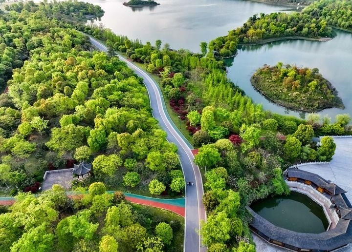 這是2022年4月5日拍攝的江西省萍鄉(xiāng)市萍水湖濕地公園(無人機照片)。萍鄉(xiāng)市將治水與綠化相結(jié)合,沿萍水河打造萍水湖濕地公園。新華社發(fā)(李桂東 攝)