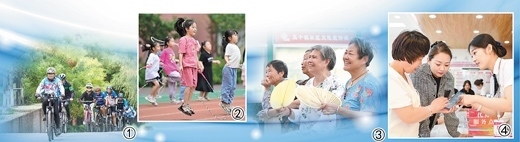 圖①:河北邯鄲市復興區(qū)沁河源景區(qū),騎行愛好者在騎行。聶長青攝 圖②:河南洛陽市瀍河回族區(qū)君河灣小學,暑期托管班的學生在跳繩。李衛(wèi)超攝 圖③:安徽合肥市蜀山區(qū)小廟鎮(zhèn)五十墩社區(qū)文化廣場,村民在看戲曲演出。陳三虎攝 圖④:內(nèi)蒙古鄂爾多斯市康巴什區(qū)寧馨社區(qū)政務便民服務站,工作人員幫居民辦業(yè)務。王 正攝
