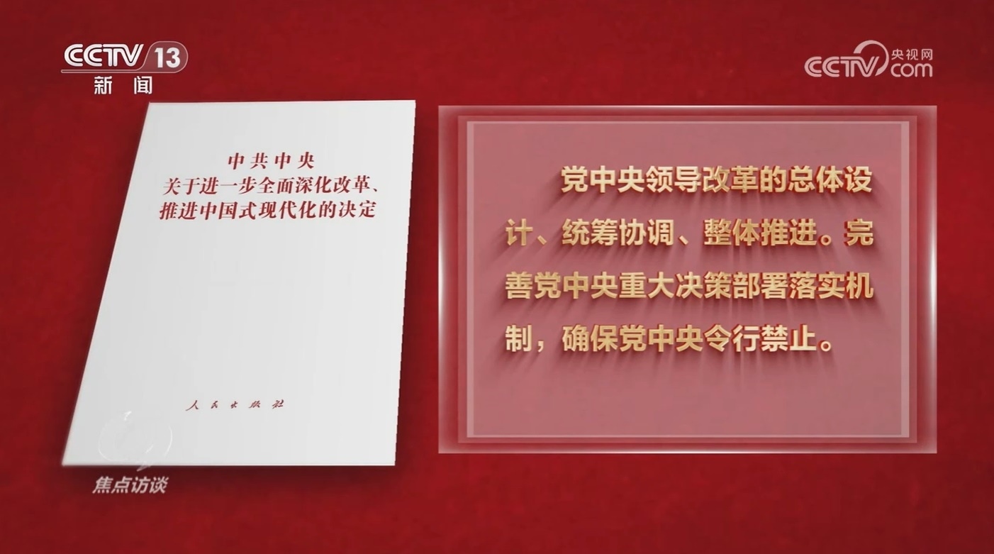 新征程上,如何提高黨對(duì)進(jìn)一步全面深化改革、推進(jìn)中國(guó)式現(xiàn)代化的領(lǐng)導(dǎo)水平?《決定》專門用一個(gè)部分來進(jìn)行部署,并從三個(gè)方面作出具體安排,第一方面的重點(diǎn)是,堅(jiān)持黨中央對(duì)進(jìn)一步全面深化改革的集中統(tǒng)一領(lǐng)導(dǎo)。