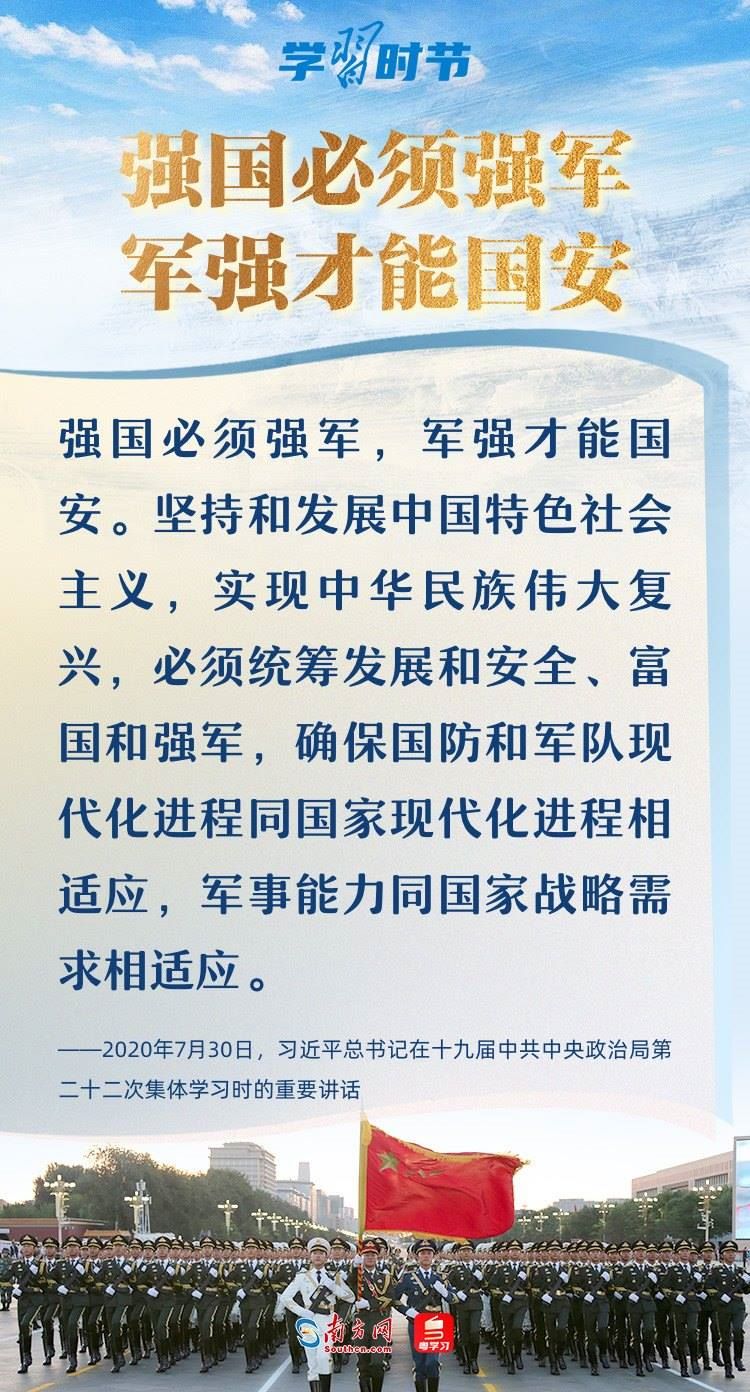 強(qiáng)國(guó)必須強(qiáng)軍,軍強(qiáng)才能?chē)?guó)安。黨的十八大以來(lái),以習(xí)近平同志為核心的黨中央領(lǐng)導(dǎo)軍隊(duì)和國(guó)防建設(shè),開(kāi)啟強(qiáng)軍興軍新征程,形成了習(xí)近平強(qiáng)軍思想,指引人民軍隊(duì)朝著實(shí)現(xiàn)新時(shí)代強(qiáng)軍目標(biāo)、全面建成世界一流軍隊(duì)奮勇前行。在八一建軍節(jié)到來(lái)之際,讓我們一起回顧總書(shū)記那些振奮人心的強(qiáng)軍話(huà)語(yǔ)。
