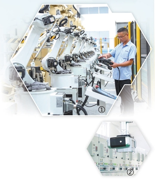 圖①:四川華鎣華鎣山經(jīng)開區(qū),企業(yè)員工在智能車間調(diào)試新安裝的機(jī)器人。邱海鷹攝(人民視覺) 圖②:寧夏銀川金鳳區(qū),智慧配電站房內(nèi)軌道式巡檢機(jī)器人正在開展自主巡檢。袁宏彥攝(人民視覺)