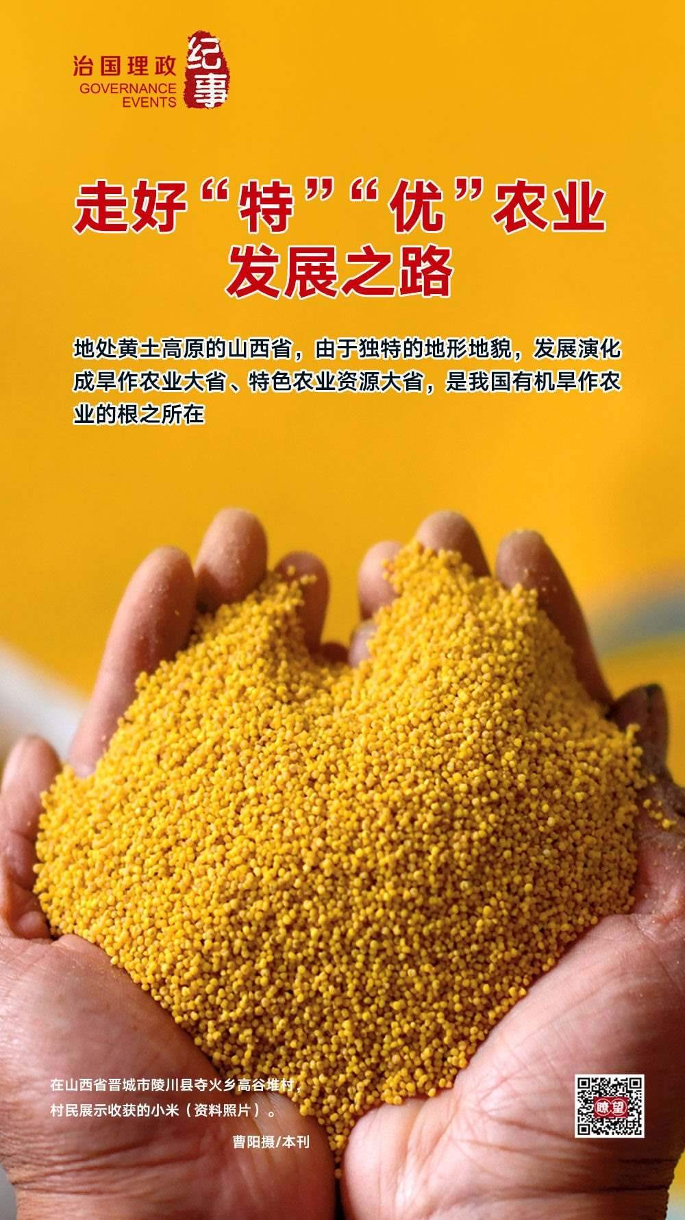 ◇2020年5月,習近平總書記在山西考察時強調,山西山多地多、地貌多元、氣候多樣,這種獨特的資源稟賦決定了山西農(nóng)業(yè)的出路在于“特”和“優(yōu)”。要深入推進農(nóng)業(yè)供給側結構性改革,提高農(nóng)業(yè)綜合效益和競爭力。