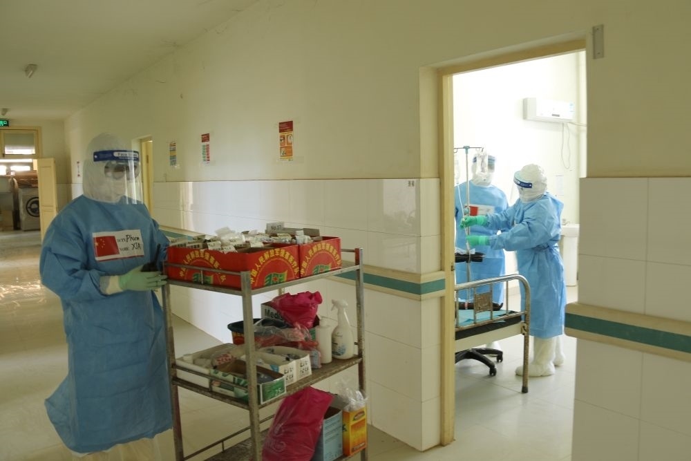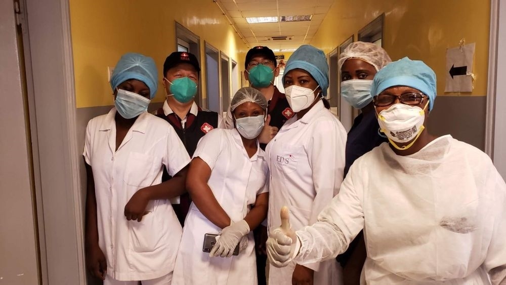 2020年5月26日,在剛果(布)首都布拉柴維爾,中國抗疫醫(yī)療專家組與當?shù)匾痪€醫(yī)務人員交流,指導新冠肺炎病房建設(shè)。
