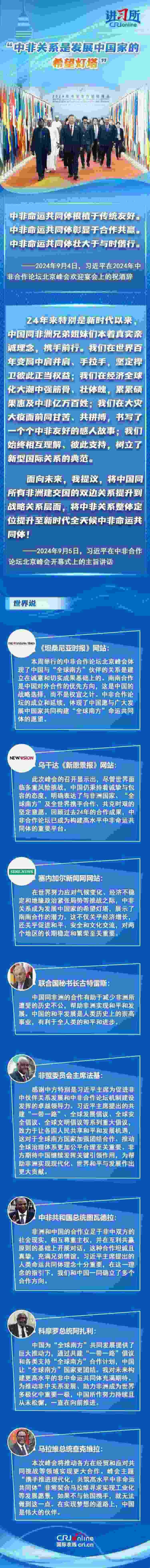 從宣布建立“新型伙伴關(guān)系”,到整體定位提升至“新時代全天候中非命運(yùn)共同體”,成立24年的中非合作論壇不斷推動中非關(guān)系實(shí)現(xiàn)跨越式發(fā)展,特別是新時代以來,中國本著真實(shí)親誠理念,同非洲兄弟姐妹們攜手前行,受到非方廣泛稱贊。非方各界認(rèn)為,為推動非中關(guān)系發(fā)展、助力非洲成為世界多極化中重要一極,中國所作努力持續(xù)且從未松懈,中非關(guān)系是發(fā)展中國家的希望燈塔。