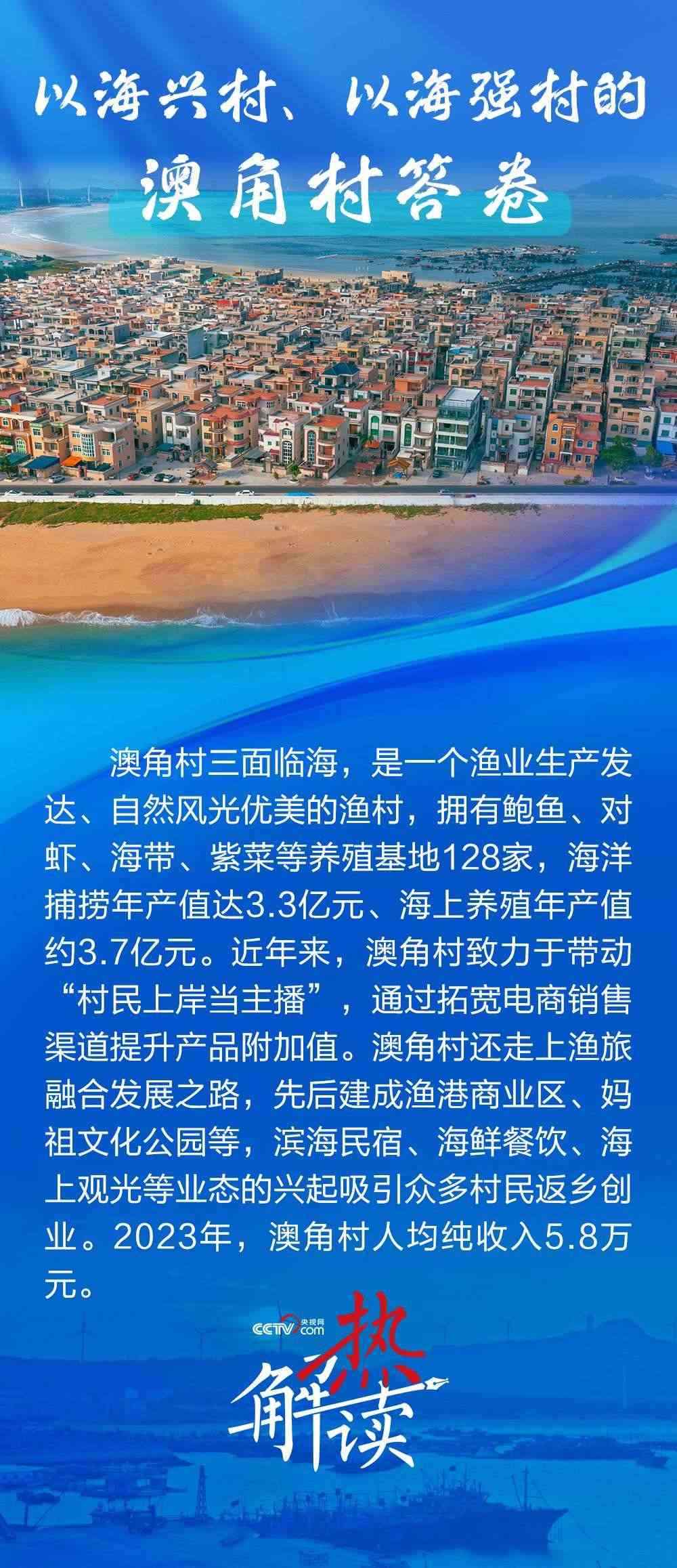澳角村三面臨海,近年來走出了一條以海興村、以海強(qiáng)村的新路子??吹洁l(xiāng)村發(fā)生了巨變,總書記直言“鄉(xiāng)村振興還是要發(fā)揚(yáng)優(yōu)勢”,并勉勵(lì)澳角村做好“?!钡奈恼拢卩l(xiāng)村振興、共同富裕的道路上一往無前。