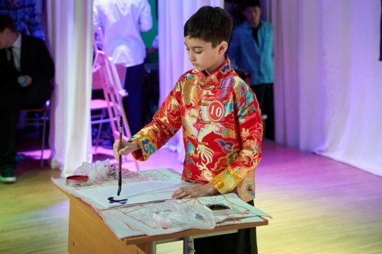 4月9日,在俄羅斯符拉迪沃斯托克,一名小學(xué)生展示中文書(shū)法。2024年中小學(xué)生“漢語(yǔ)橋”中文比賽4月9日在符拉迪沃斯托克市國(guó)際語(yǔ)言學(xué)校舉行。新華社發(fā)