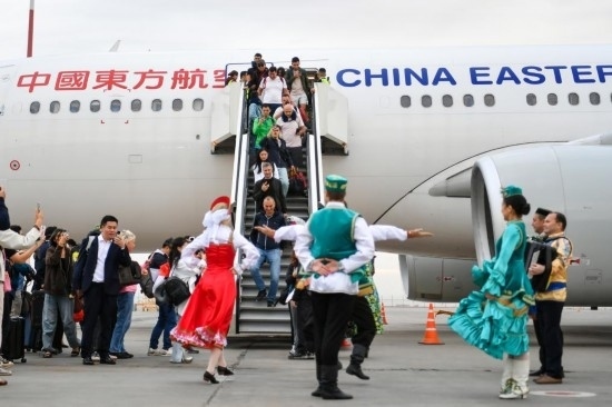9月28日,東航“上海-喀山”直飛首航航班的旅客抵達(dá)俄羅斯韃靼斯坦共和國(guó)喀山國(guó)際機(jī)場(chǎng)。新華社記者 曹陽(yáng) 攝