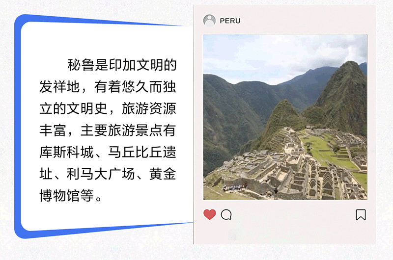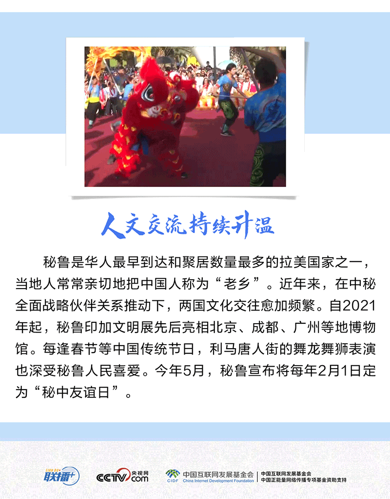 中國和秘魯都是文明古國,兩國友誼源遠(yuǎn)流長(zhǎng),人民友好深入人心。習(xí)近平主席曾以“秘魯是中國在太平洋對(duì)岸的‘鄰居’”形容中秘關(guān)系,生動(dòng)詮釋了兩國和兩國人民之間“相知無遠(yuǎn)近”的深厚友誼。