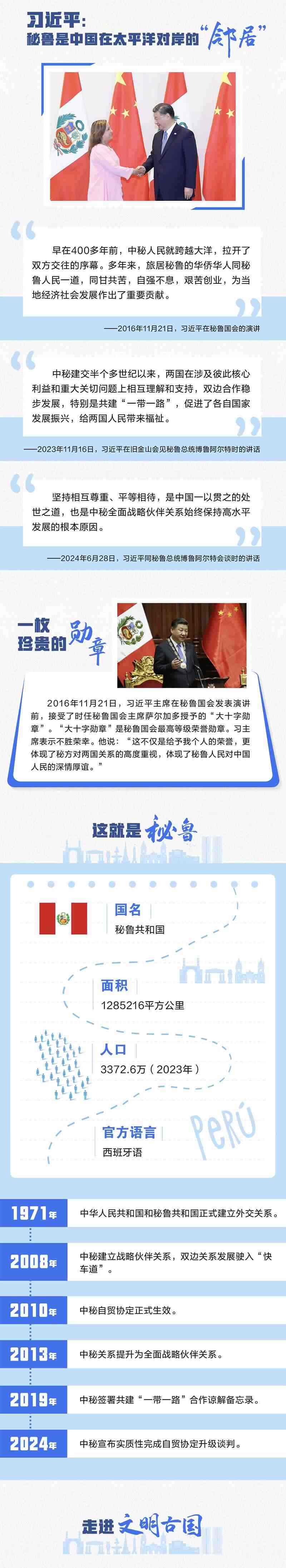 應(yīng)秘魯共和國總統(tǒng)博魯阿爾特邀請(qǐng),習(xí)近平主席將對(duì)秘魯進(jìn)行國事訪問。不到半年的時(shí)間,中秘領(lǐng)導(dǎo)人實(shí)現(xiàn)互訪,顯示了雙方高水平的政治互信。