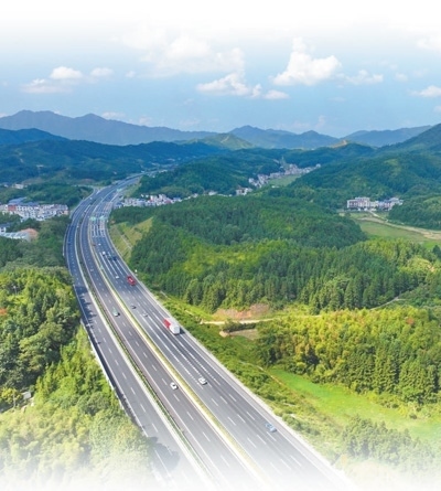 江西省吉安市遂川縣巾石鄉(xiāng)湯村村,車輛在泰贛高速公路上疾馳,綠樹(shù)群山與鄉(xiāng)村農(nóng)房相映成景。朱海鵬攝(人民視覺(jué))