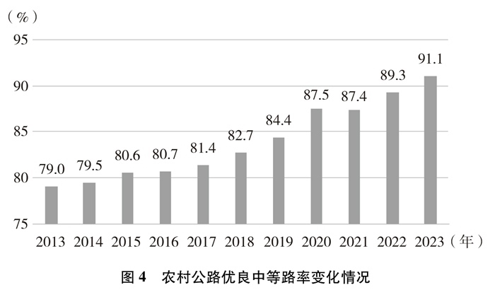 技術(shù)等級(jí)逐年提高。截至2023年底,農(nóng)村公路等級(jí)路②里程及比例分別達(dá)到445萬(wàn)公里和96.8%,鋪裝路面里程及比例分別達(dá)到422萬(wàn)公里和91.8%,十年間分別提高了11.9個(gè)百分點(diǎn)、27.2個(gè)百分點(diǎn)。