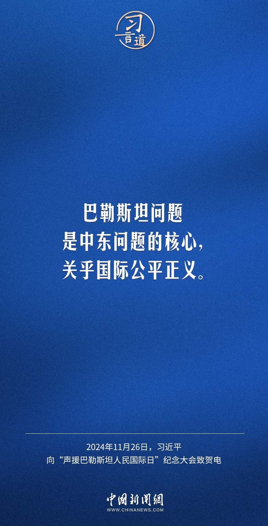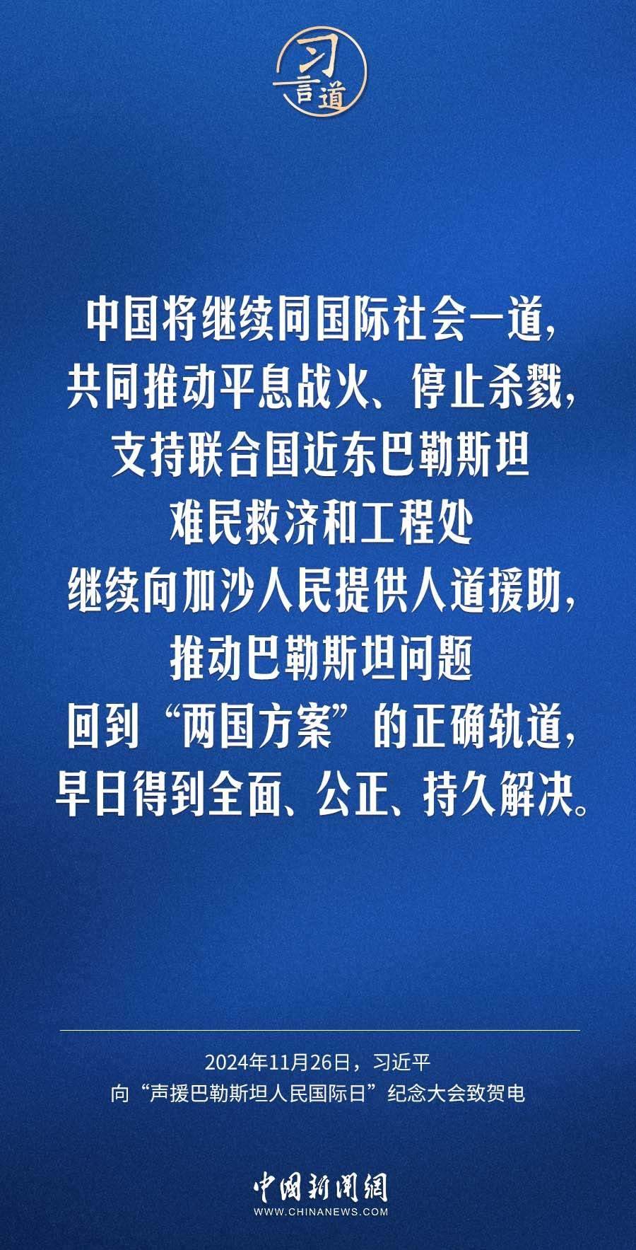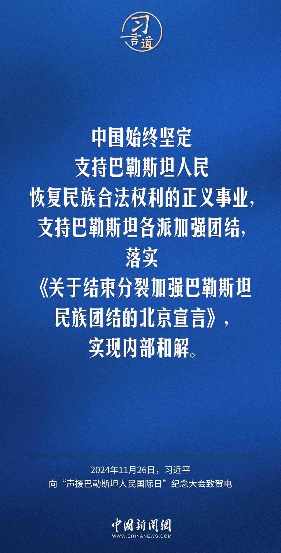 11月26日,聯(lián)合國舉行“聲援巴勒斯坦人民國際日”紀(jì)念大會,國家主席習(xí)近平向大會致賀電。習(xí)近平指出——