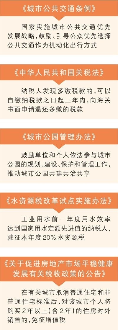 編者按:鼓勵、引導(dǎo)公眾優(yōu)先選擇公共交通作為機動化出行方式;保持現(xiàn)行關(guān)稅稅制基本穩(wěn)定;鼓勵單位和個人參與城市公園的規(guī)劃、建設(shè)、管理……12月起,《城市公共交通條例》《中華人民共和國關(guān)稅法》《城市公園管理辦法》等一批法律法規(guī)正式施行,切實以法治力量推動經(jīng)濟社會高質(zhì)量發(fā)展。