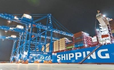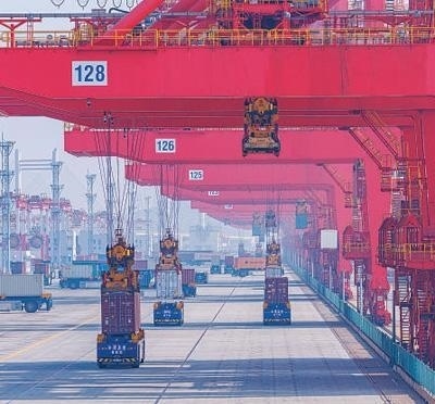 軟聯(lián)通共建“一帶一路”國(guó)家在工作制度對(duì)接、技術(shù)標(biāo)準(zhǔn)協(xié)調(diào)、檢驗(yàn)結(jié)果互認(rèn)等方面強(qiáng)化合作、統(tǒng)一標(biāo)準(zhǔn),貿(mào)易自由化便利化水平不斷提升。上海洋山港海關(guān)對(duì)接共建國(guó)家進(jìn)出口貨物相關(guān)標(biāo)準(zhǔn),推動(dòng)通關(guān)一體化方式申報(bào),提升通關(guān)效率。圖為無人駕駛的全自動(dòng)導(dǎo)引車在洋山港穿梭往來,搬運(yùn)集裝箱。王 初攝(影像中國(guó))