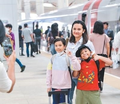 硬聯(lián)通雅萬高鐵是我國(guó)在境外完成全過程勘察設(shè)計(jì)建設(shè)的首個(gè)高鐵項(xiàng)目,于去年10月17日正式開通運(yùn)營(yíng),是中印尼共建“一帶一路”合作的典范。圖為乘客在和雅萬高鐵動(dòng)車組合影留念。新華社記者 徐 欽攝