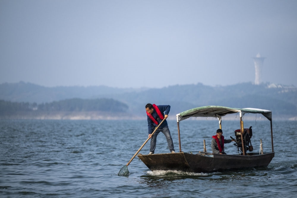 2024年10月28日,丹江口市清漂隊(duì)隊(duì)員在庫(kù)區(qū)進(jìn)行清漂作業(yè)。