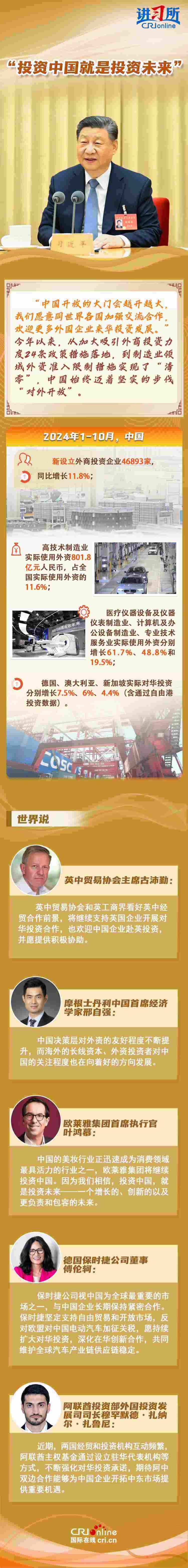 “中國是實干家、行動派?!苯衲暌詠恚瑥牧?xí)近平主席的歐洲之行到拉美之行,再到四天前在北京會見主要國際經(jīng)濟(jì)組織負(fù)責(zé)人,習(xí)近平一直強調(diào),中國的發(fā)展將給世界帶來巨大機(jī)遇。據(jù)聯(lián)合國貿(mào)易和發(fā)展會議不久前發(fā)布的《世界投資報告2024》中文版顯示,中國吸引外資的結(jié)構(gòu)不斷優(yōu)化、質(zhì)量不斷提高,多位政商界人士也認(rèn)為中國是一個非常有前景的市場,投資中國就是投資未來。