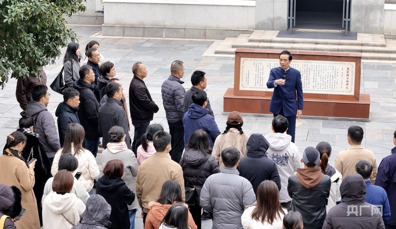 胡昇正在給游客講解青山生態(tài)蝶變的故事(央廣網(wǎng)見習(xí)記者鄧子依 攝)