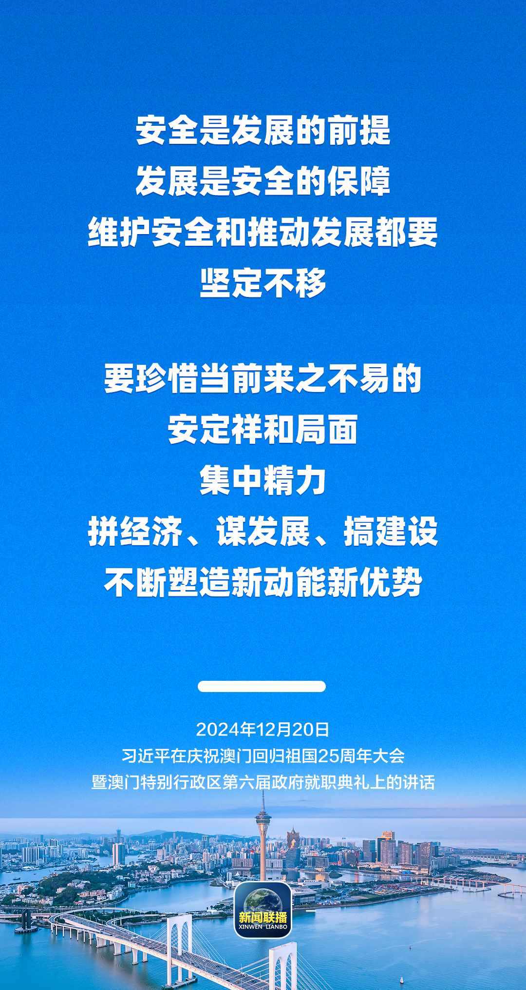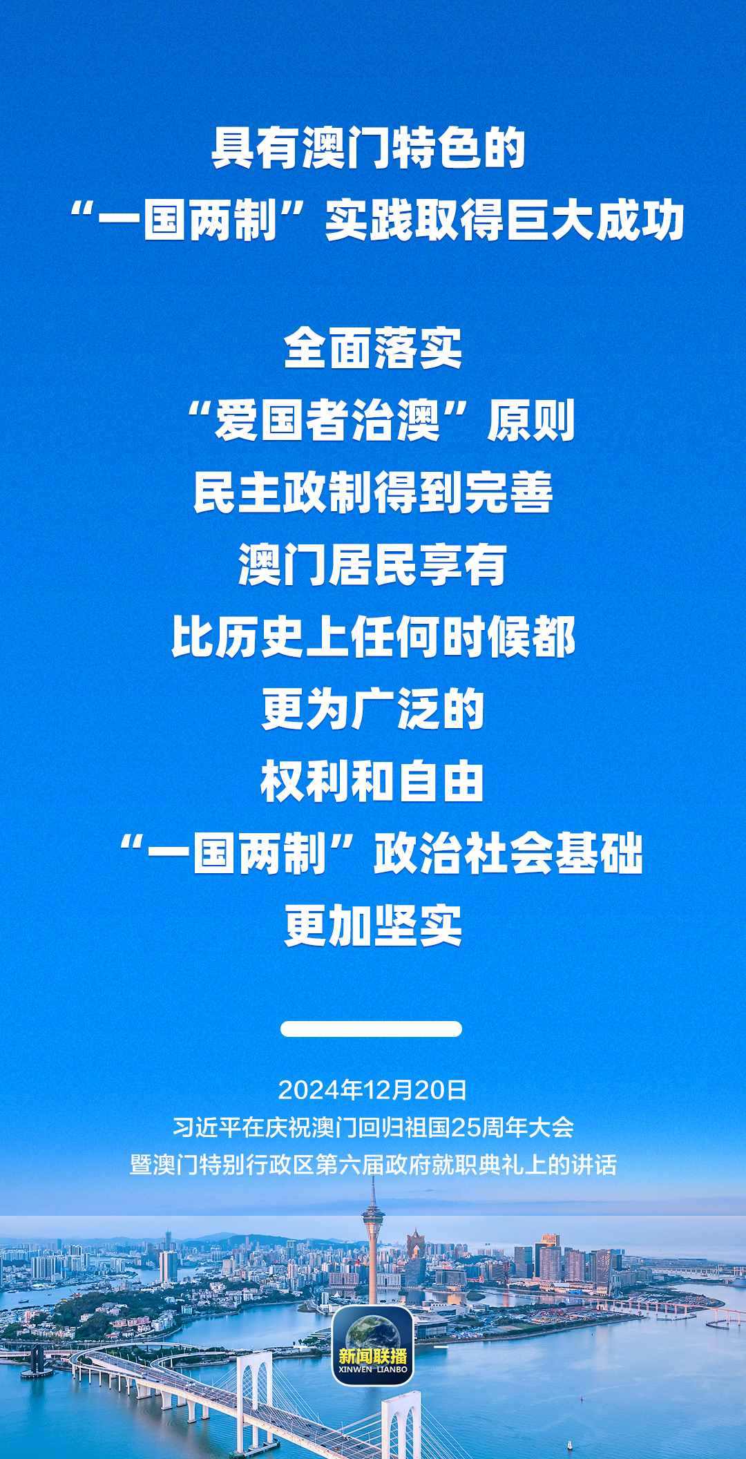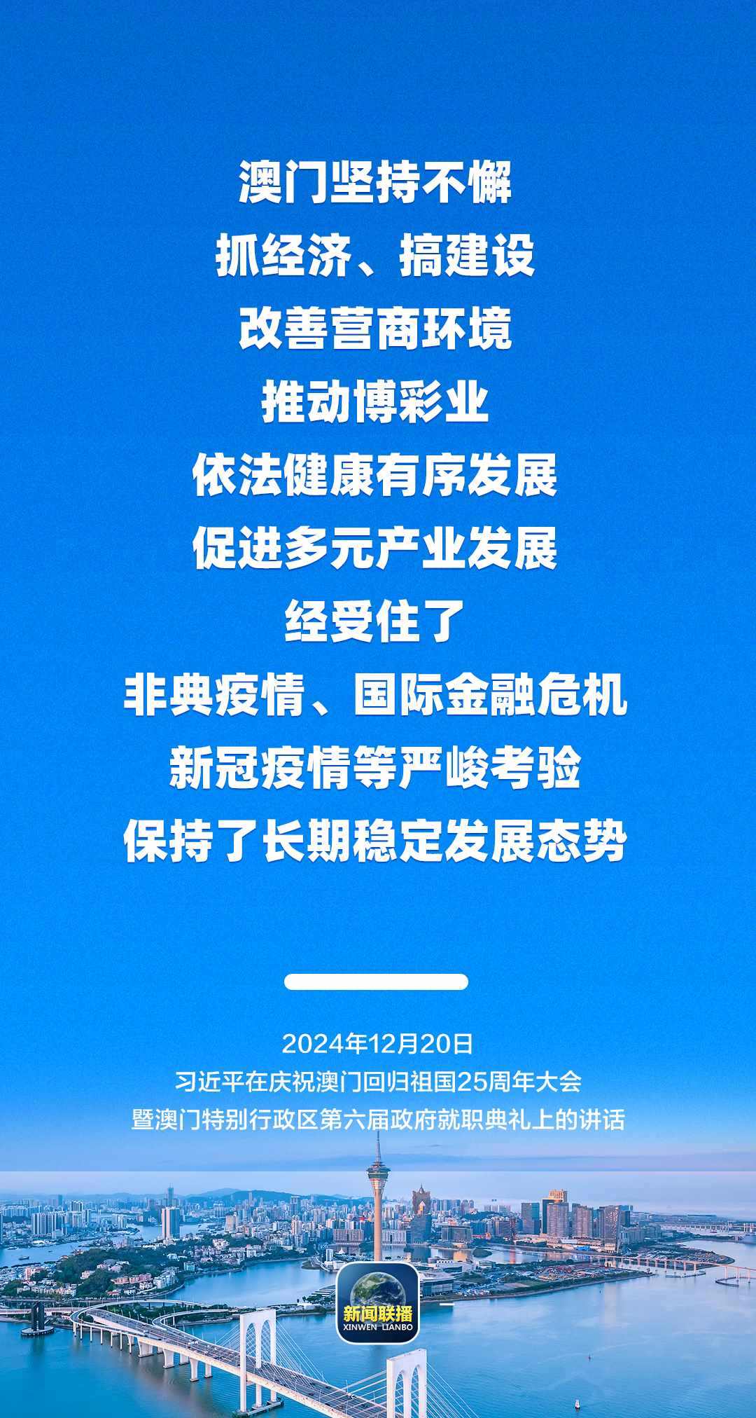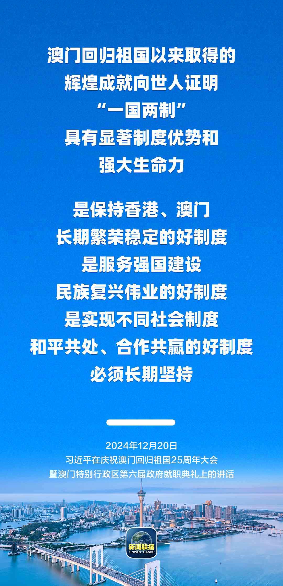 習(xí)近平強調(diào),只要全面準確、堅定不移貫徹“一國兩制”方針,有特別行政區(qū)政府和社會各界共同努力,有偉大祖國作堅強后盾,澳門一定能打開發(fā)展新天地、不斷創(chuàng)造新輝煌,一定能為以中國式現(xiàn)代化全面推進強國建設(shè)、民族復(fù)興偉業(yè)作出更大貢獻。