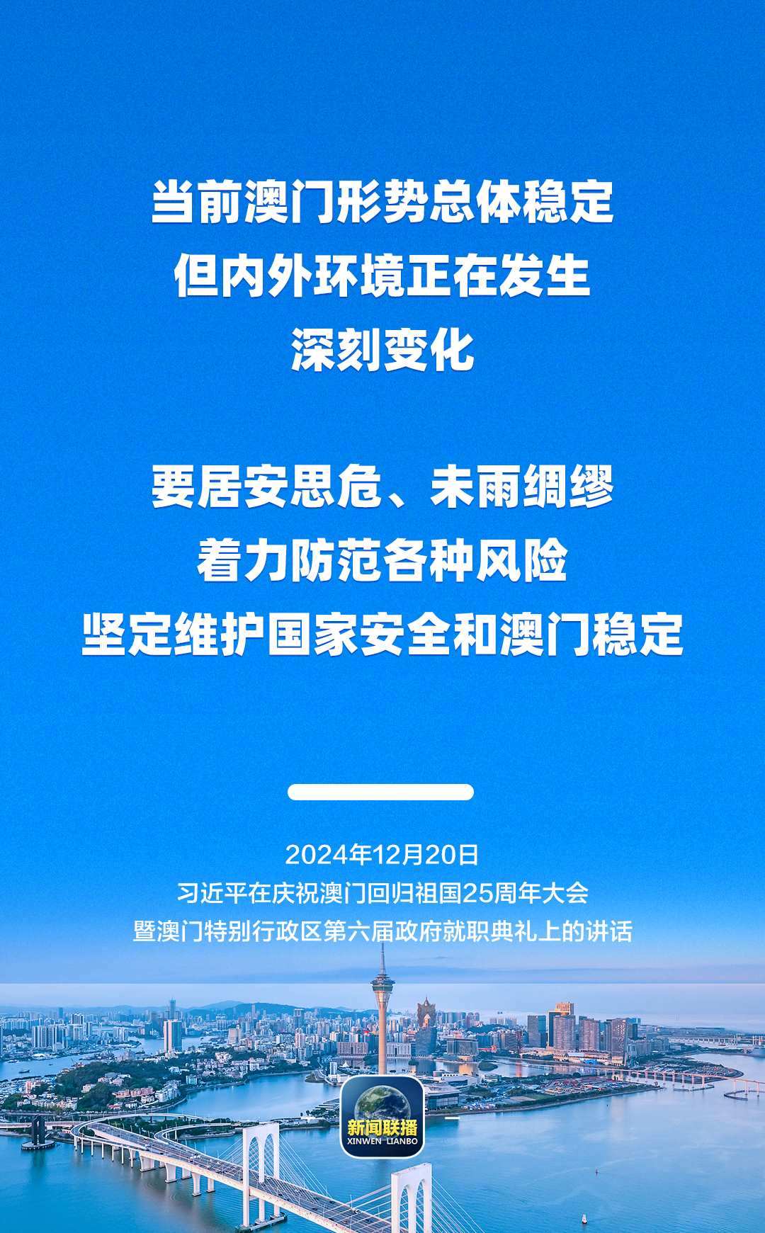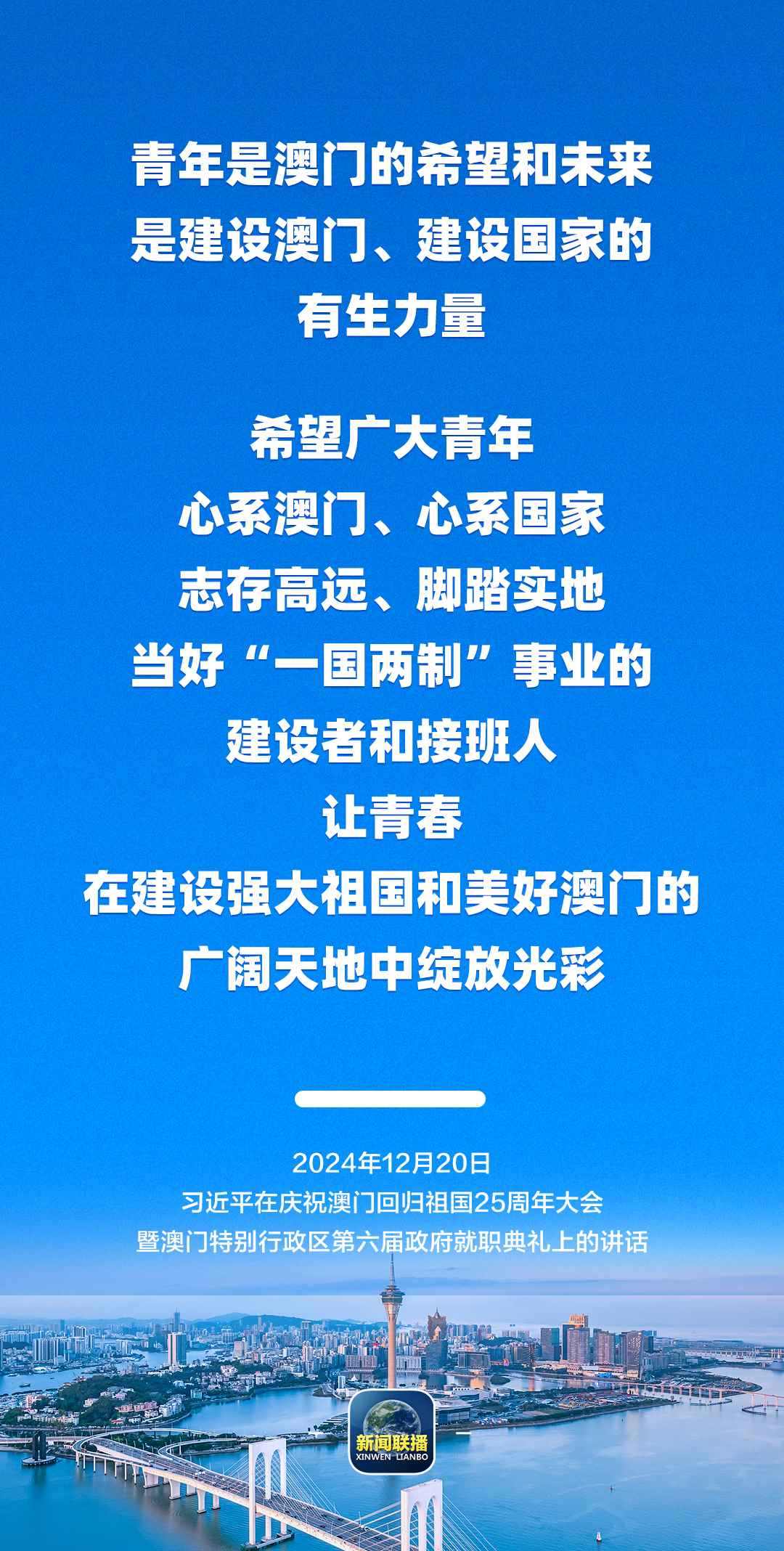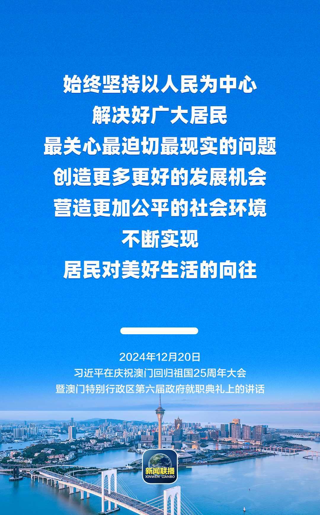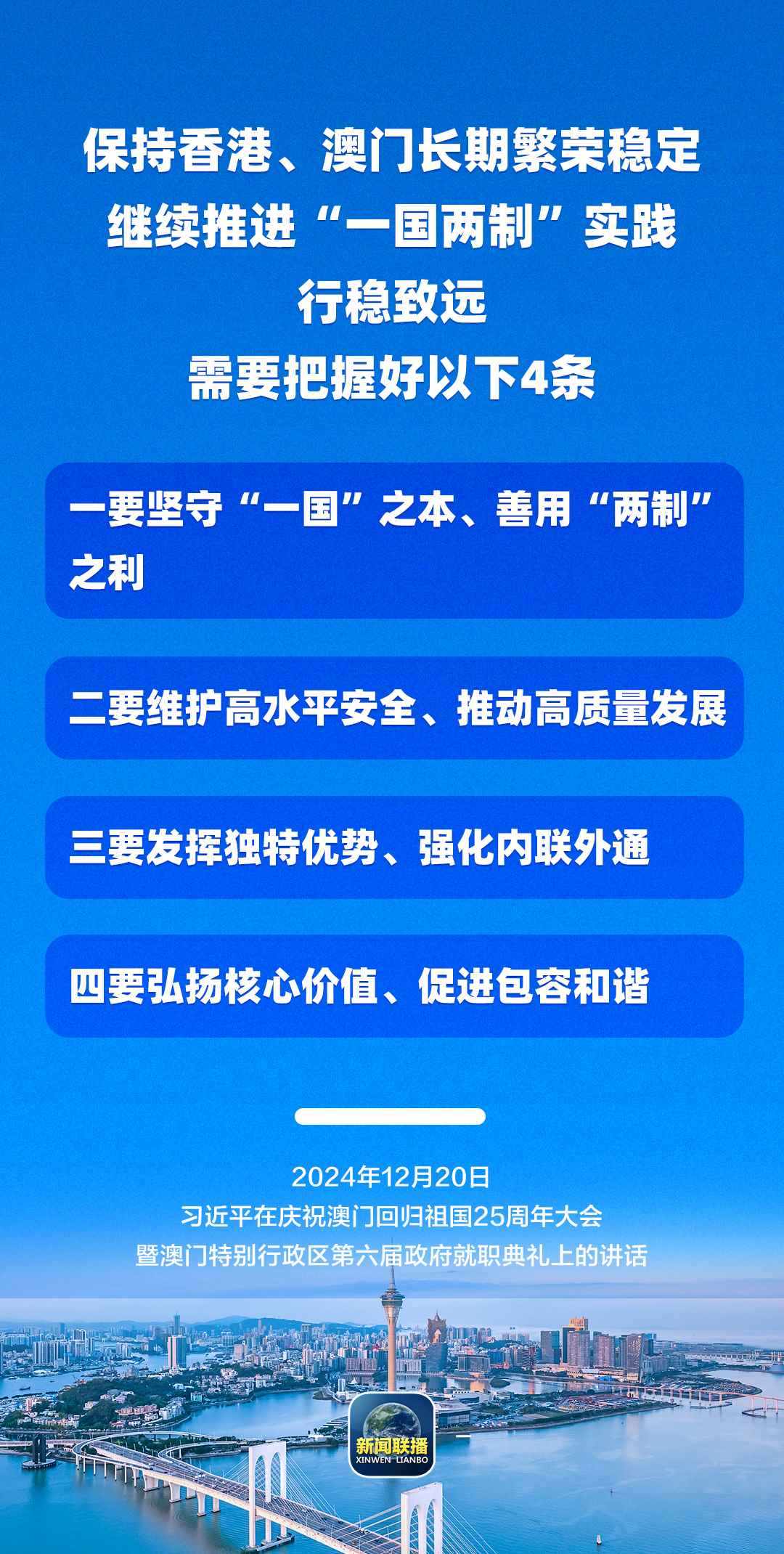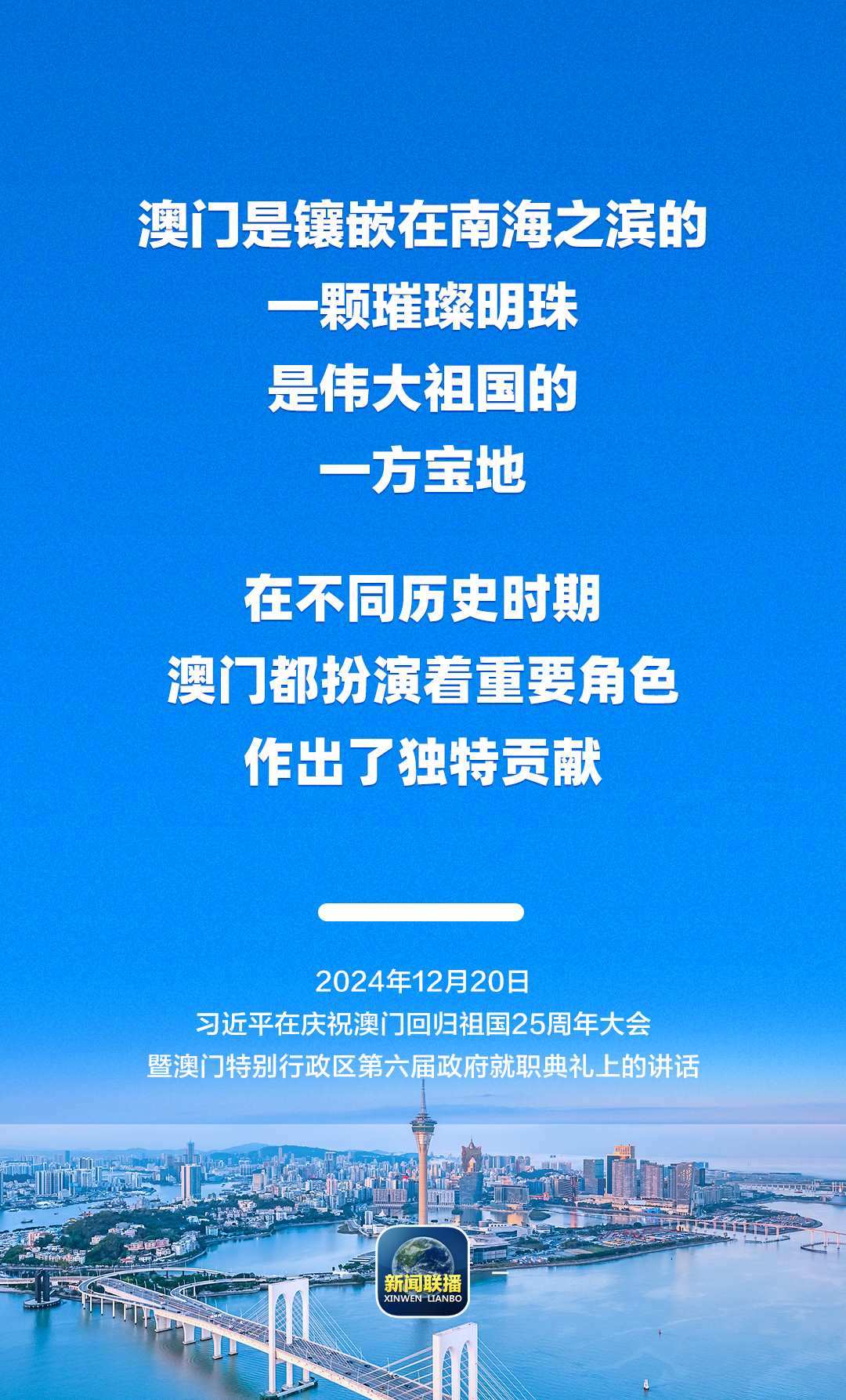 習(xí)近平強調(diào),只要全面準確、堅定不移貫徹“一國兩制”方針,有特別行政區(qū)政府和社會各界共同努力,有偉大祖國作堅強后盾,澳門一定能打開發(fā)展新天地、不斷創(chuàng)造新輝煌,一定能為以中國式現(xiàn)代化全面推進強國建設(shè)、民族復(fù)興偉業(yè)作出更大貢獻。