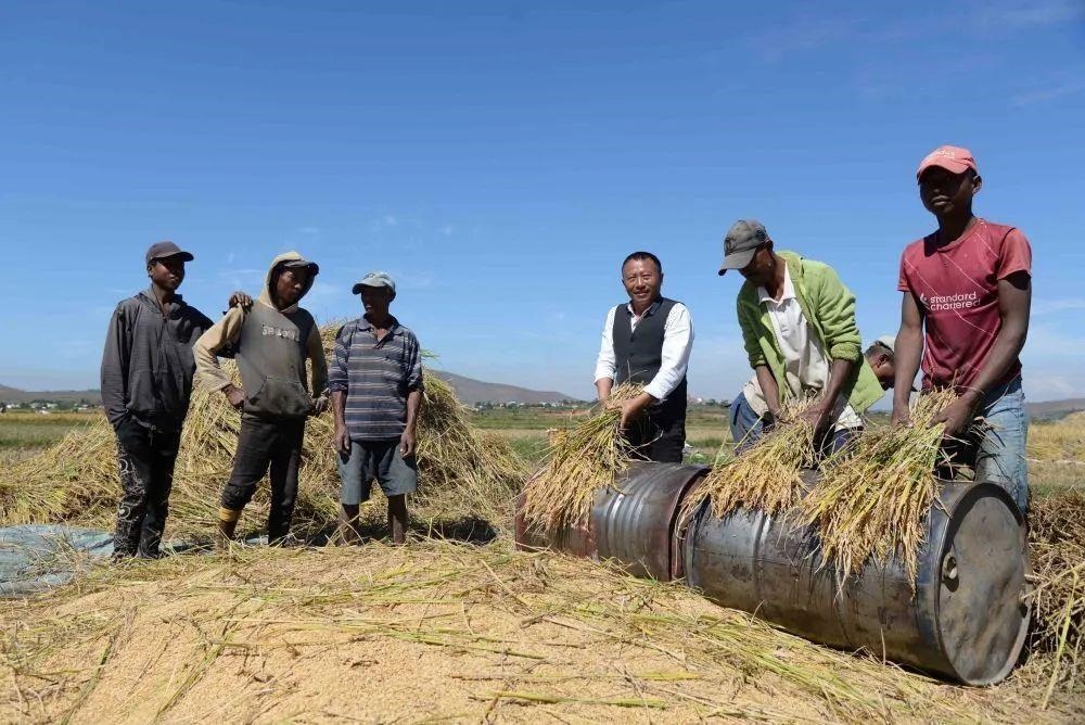 △在馬達(dá)加斯加,中國(guó)雜交水稻技術(shù)專(zhuān)家和當(dāng)?shù)剞r(nóng)民一起收獲水稻。