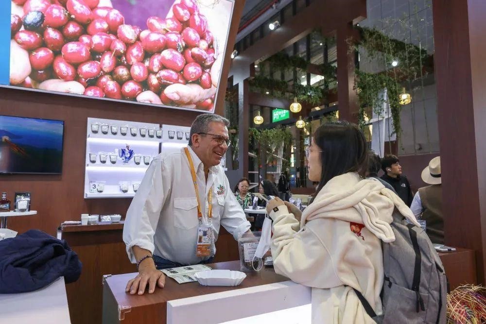△2024年11月5日,第七屆進(jìn)博會(huì)國(guó)家展尼加拉瓜館的工作人員向觀(guān)眾介紹商品。
