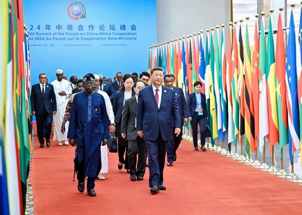 △2024年9月5日,中非合作論壇北京峰會(huì)開(kāi)幕式,習(xí)近平主席同外方領(lǐng)導(dǎo)人共同步入會(huì)場(chǎng)。