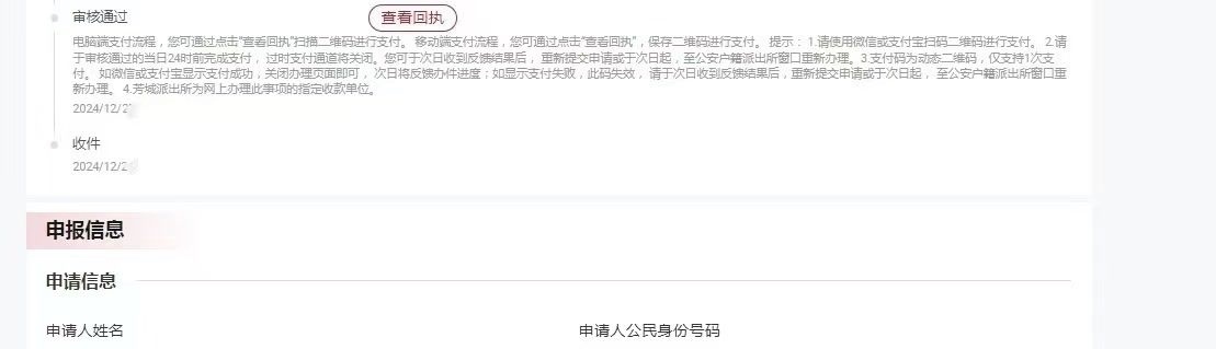第二步:收到審核通過(guò)的短信提示后,使用電腦終端再次登錄北京市政務(wù)服務(wù)網(wǎng)進(jìn)入“個(gè)人空間--我的辦件”,點(diǎn)擊“查看回執(zhí)”,使用微信或支付寶掃描二維碼進(jìn)行支付。支付成功后,等待公安機(jī)關(guān)制作證件。
