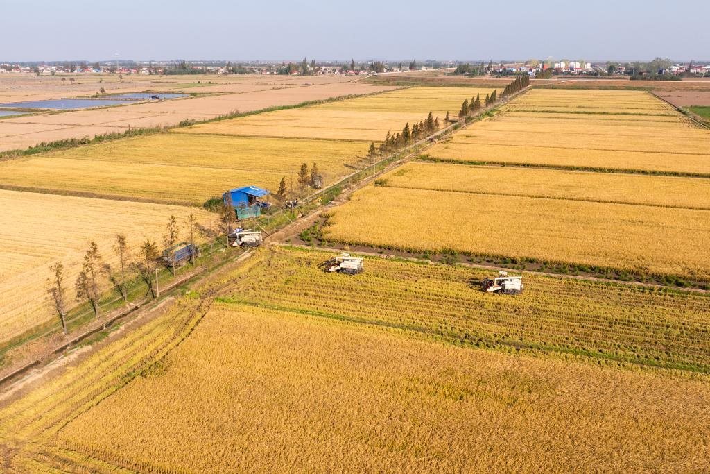 在湖南省岳陽市華容縣團洲垸,村民駕駛收割機收獲水稻(2024年11月1日攝,無人機照片)。新華社記者 陳思汗 攝