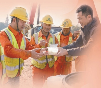 浙江省湖州市長興縣泗安鎮(zhèn)東村村干部為高速改擴(kuò)建項(xiàng)目施工人員送餃子。
