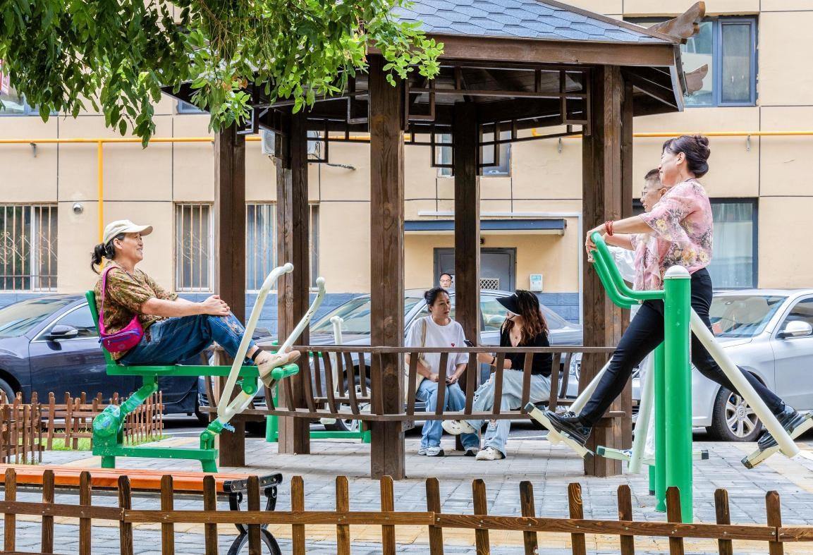 2024年8月26日,內蒙古呼和浩特市玉泉區(qū)綠緣小區(qū),居民在改造后的運動休閑區(qū)健身。