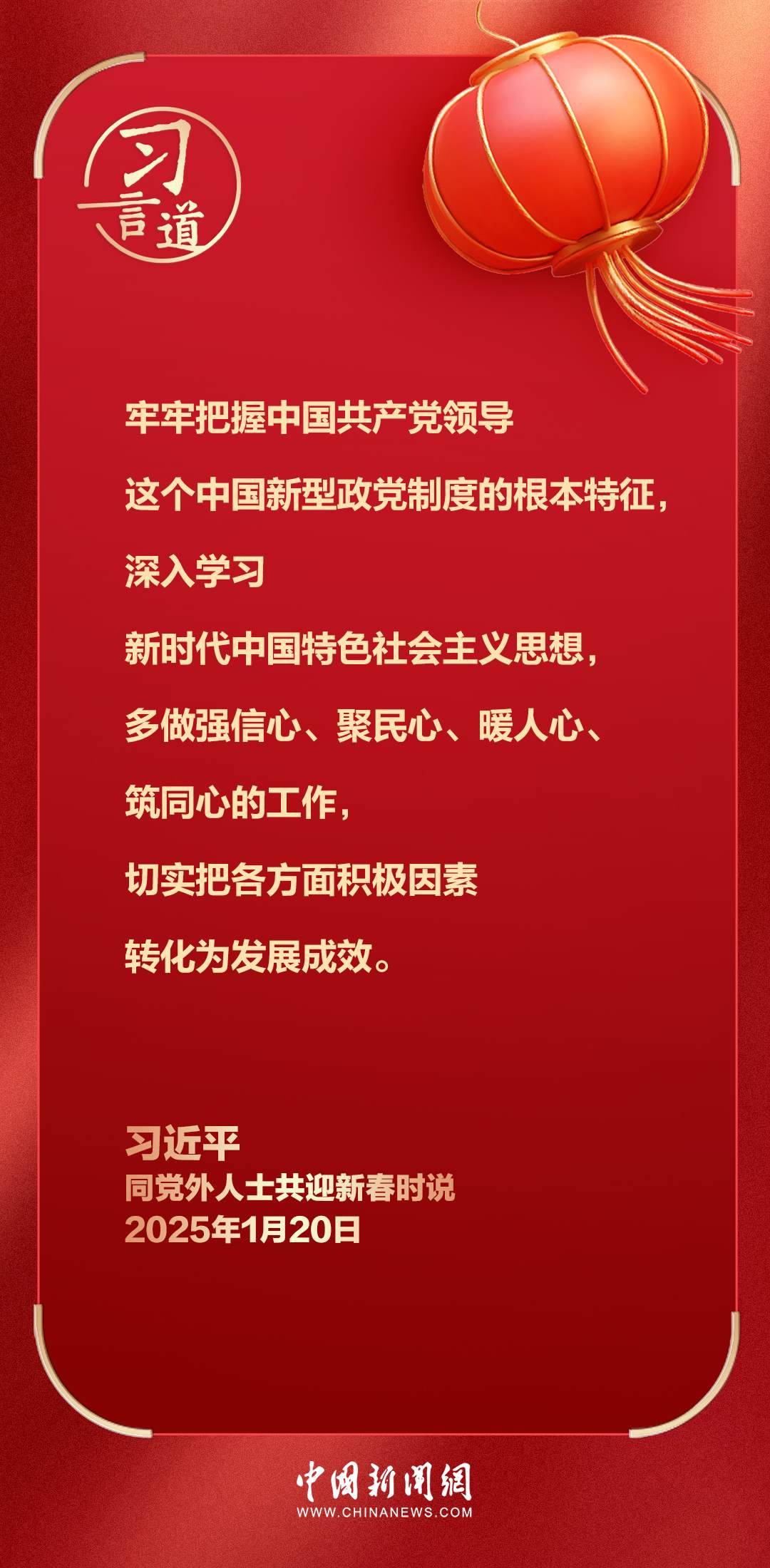 在中華民族傳統(tǒng)節(jié)日乙巳蛇年春節(jié)即將到來之際,中共中央總書記、國家主席、中央軍委主席習近平20日在人民大會堂同各民主黨派中央、全國工商聯(lián)負責人和無黨派人士代表歡聚一堂,共迎佳節(jié)。習近平代表中共中央,向各民主黨派、工商聯(lián)和無黨派人士,向統(tǒng)一戰(zhàn)線廣大成員,致以誠摯問候和新春祝福。