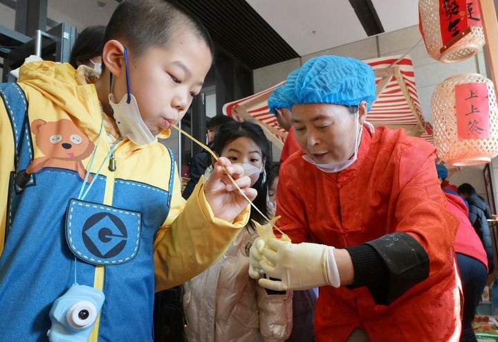 2025年1月29日,小朋友在位于北京的中國(guó)非物質(zhì)文化遺產(chǎn)館舉行的“過(guò)年——春節(jié)主題展”上體驗(yàn)“吹糖人”。新華社記者 李賀 攝