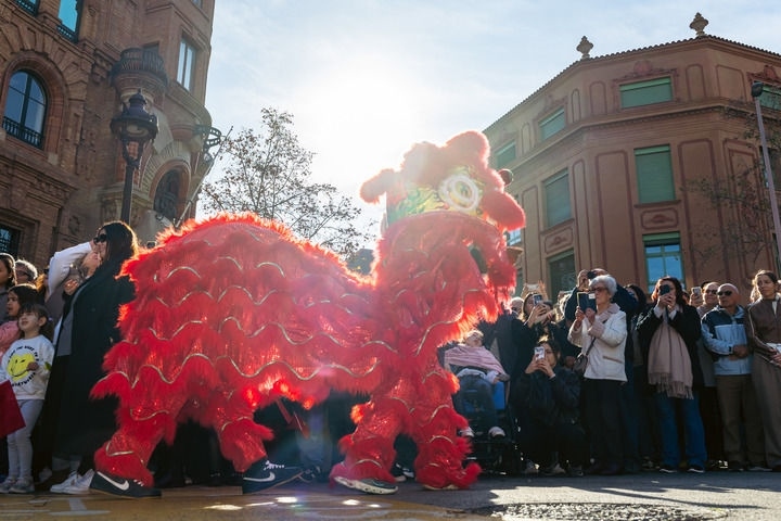 2025年1月25日,在西班牙巴塞羅那,演員在“與巴塞羅那共慶新春佳節(jié)”活動(dòng)上表演舞獅。新華社發(fā)(胡安·戈薩攝)