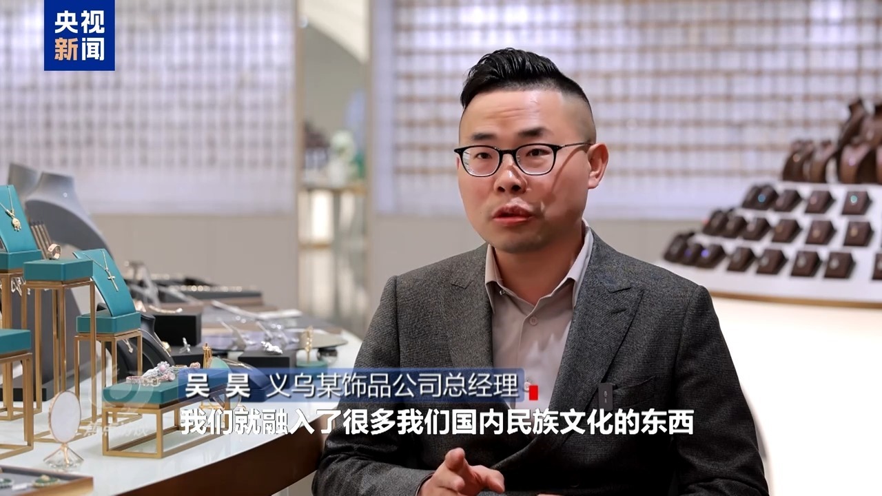 義烏某飾品公司總經(jīng)理 吳昊:在這一塊,融入了很多我們國內(nèi)民族文化的東西,重新組合去創(chuàng)造,他們都會喜歡這個東西。其實歸根結(jié)底,還是我們通過這么多年的發(fā)展,我們國家人民的日子越過越好的時候,這個民族文化的自信是從國人的骨子里面迸發(fā)出一種自信的體現(xiàn)。
