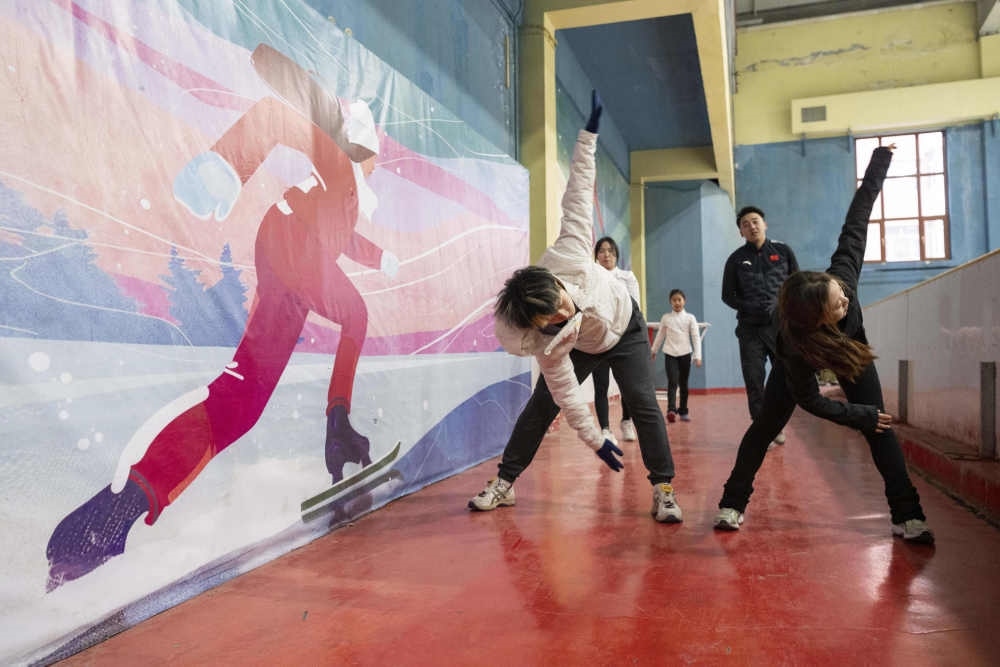 2023年3月14日,一名中學(xué)體育老師在河北張家口冰之夢(mèng)滑冰場(chǎng)指導(dǎo)學(xué)生。在張家口這座“冬奧之城”,市民百姓參加冰雪運(yùn)動(dòng)已經(jīng)蔚然成風(fēng),“全季全體育”理念發(fā)展成為城市新名片。
