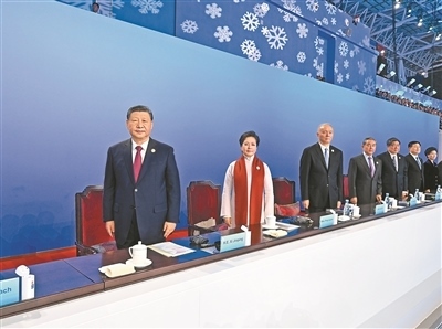 19時(shí)58分,在《和平——命運(yùn)共同體》的樂曲聲中,習(xí)近平和夫人彭麗媛,同國際奧委會(huì)主席巴赫、亞奧理事會(huì)第一副主席霍震霆等步入主席臺(tái),向觀眾揮手致意。全場響起長時(shí)間的熱烈掌聲。