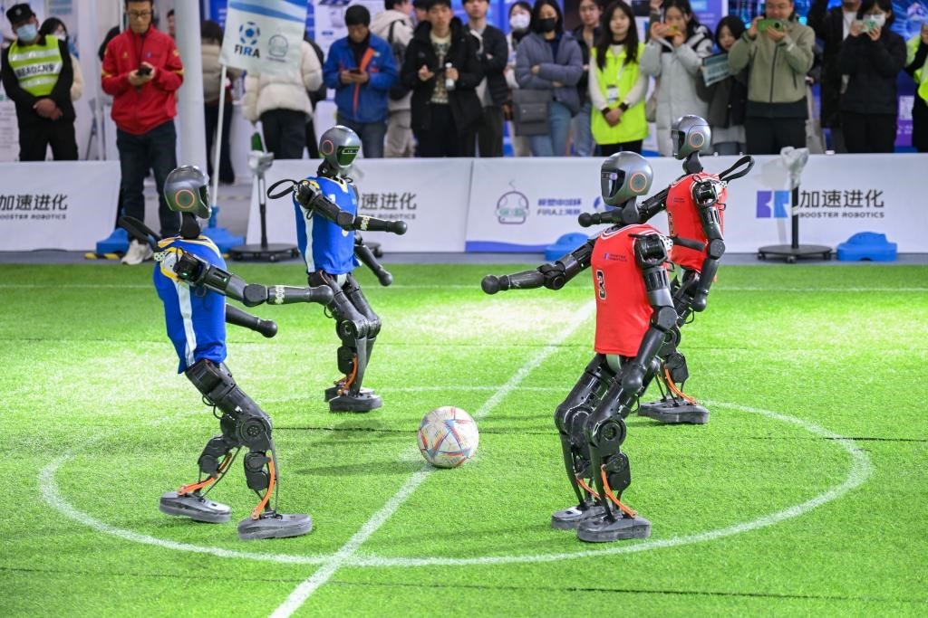 2月21日,機(jī)器人在2025全球開發(fā)者先鋒大會(huì)現(xiàn)場(chǎng)踢足球。 新華社發(fā)(陳浩明 攝)